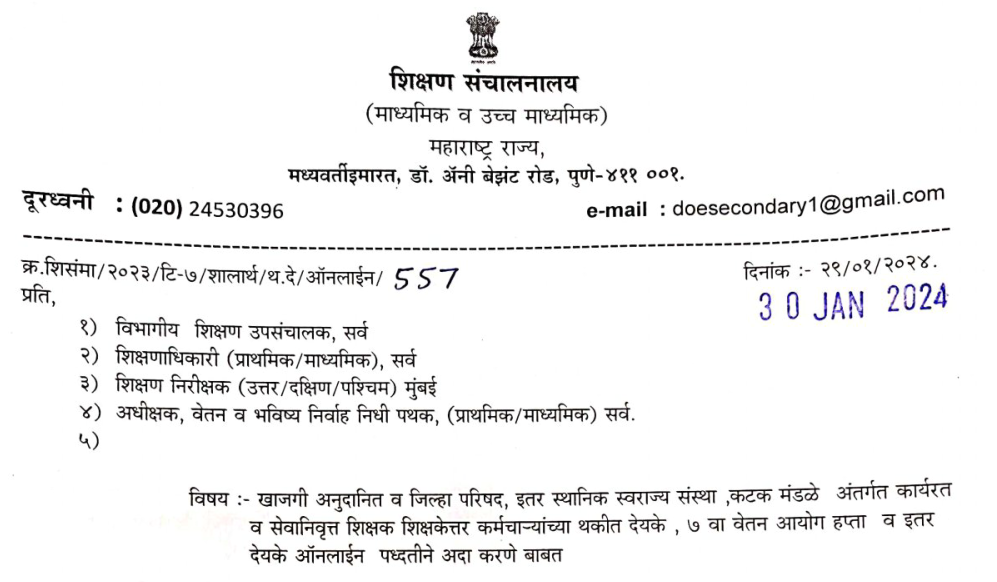 खाजगी अनुदानित व जिल्हा परिषद, इतर स्थानिक स्वराज्य संस्था, कटक मंडळे अंतर्गत कार्यरत व सेवानिवृत्त शिक्षक शिक्षकेत्तर कर्मचाऱ्यांच्या थकीत देयके, ७ वा वेतन आयोग हप्ता व इतर देयके ऑनलाईन पध्दतीने अदा करणे बाबत